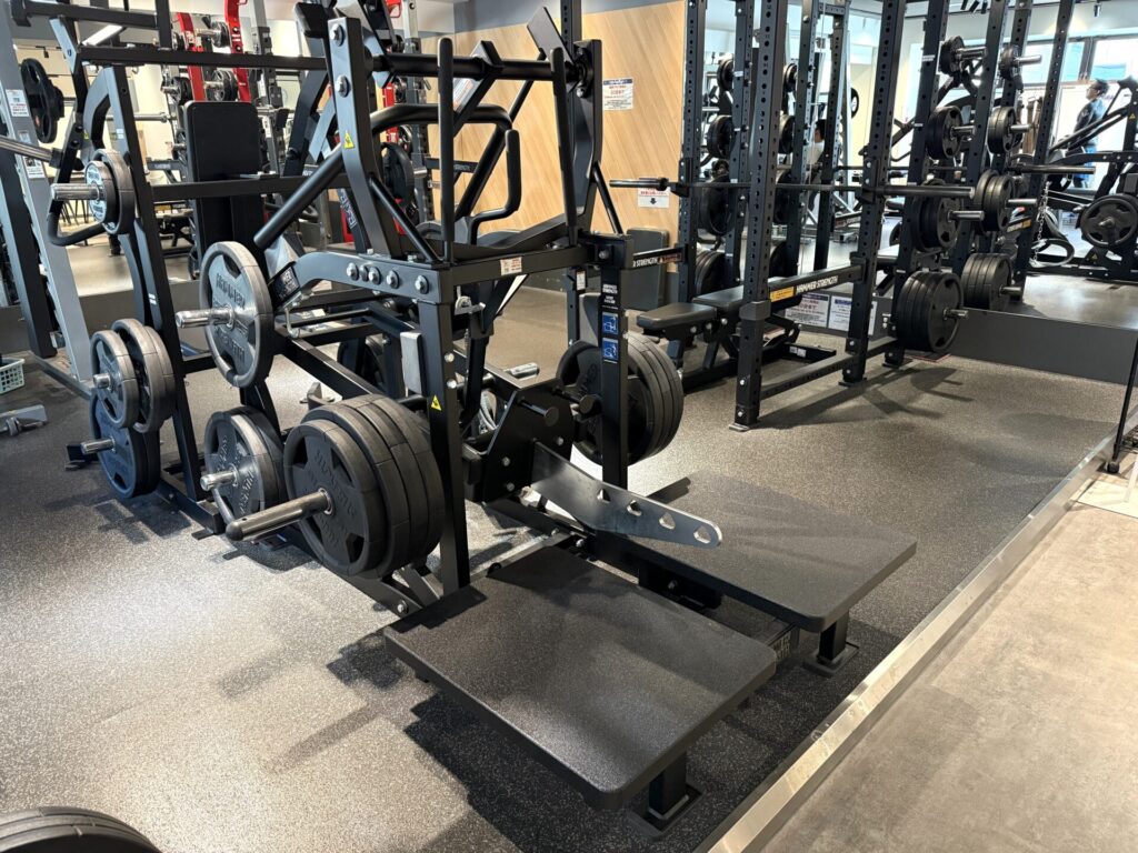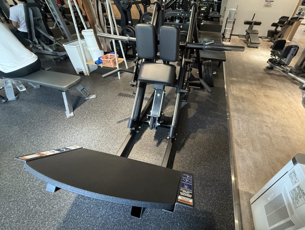 ベルトを介して重りを下から引き上げるタイプのスクワットマシンです。