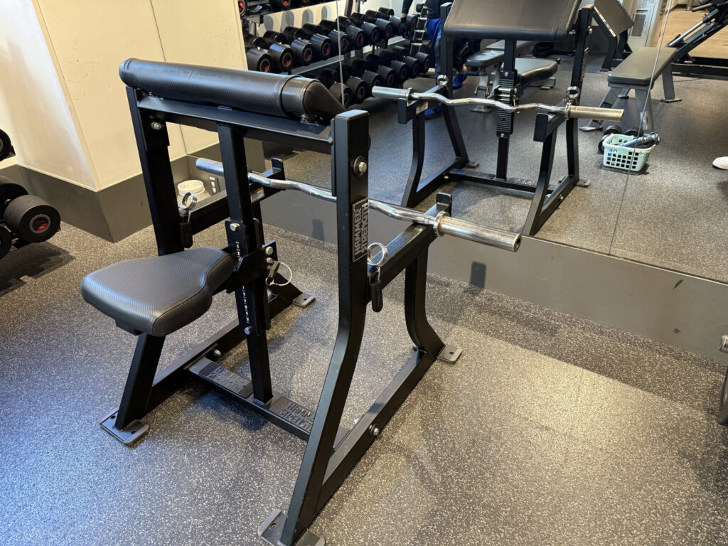 ベンチを高角度に設定し、斜め上方向へ腕を押し出す動作を行うマシンです。