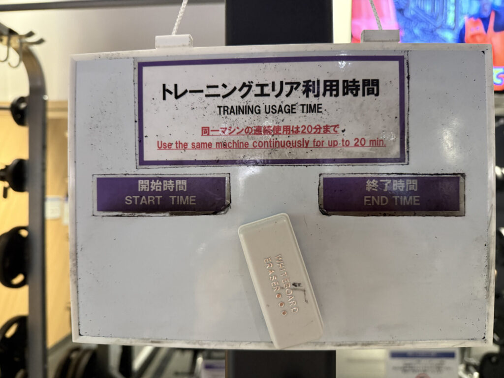 マシンの利用時間は20分で、ホワイトボードに記入する方式です。