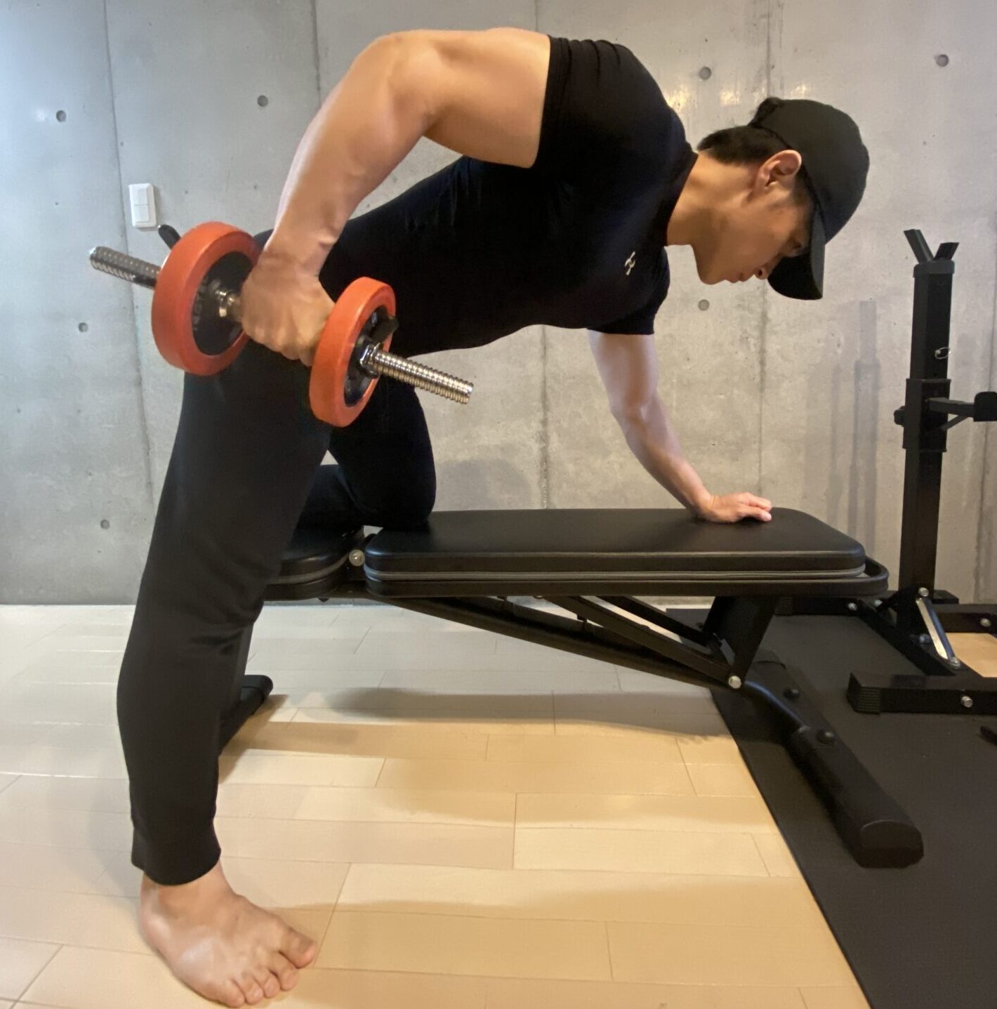 ダンベルロウは角度を付けなくてもできる種目なので、このフラットベンチでも行えます。